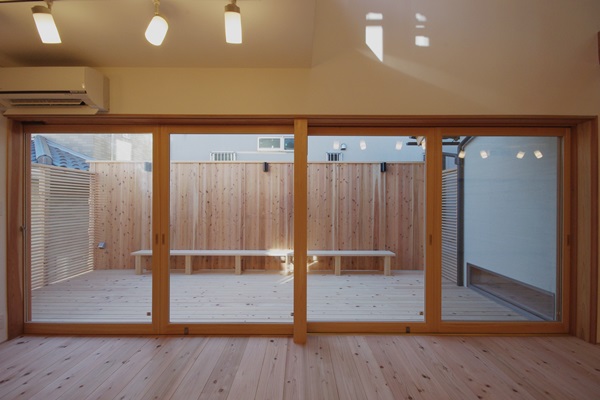 愛 知県長久手市は市民の平均年齢が日本一若いまちです。その新興住宅地の一区画に木組みの家が完成しました。ご主人は自動車の設計をされており、毎日の仕事 の反動からか手仕事にこだわられました。建築主のおじいさんが孫のために植えた木を伐り、水中乾燥をしました。軸組みはもちろん手刻みで、屋根はいぶし瓦 葺き、壁や天井は漆喰塗りです。