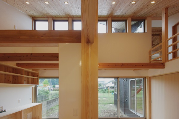 子 供たちが開放的にのびのびと暮らせるようにと、児童公園に隣接した敷地を選ばれました。LDKと児童公園の間に中庭を挟んで、視界を遮らないように大きな 開口を設けました。間仕切りは必要最小限とし、2階もワンフロアになっています。DKの上部には、将来ロフトが増設できるよう、梁を設けています。